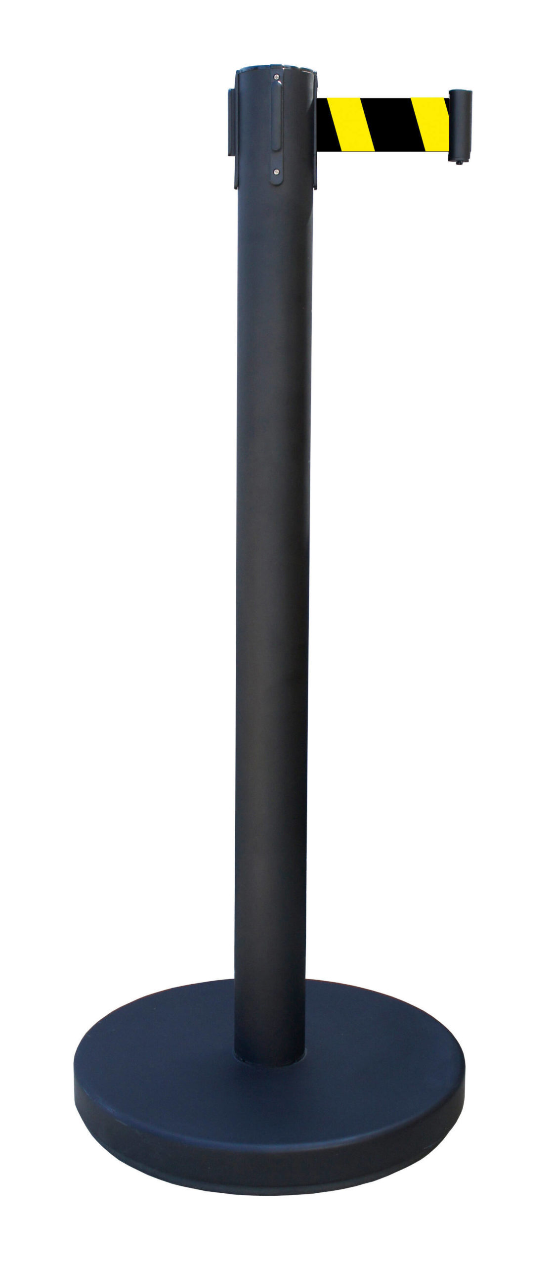 Poteau noir à sangle noire/jaune en polypropylène et acier Ø 63 x H 910 mm – sangle : l. 50 x L 3000 mm