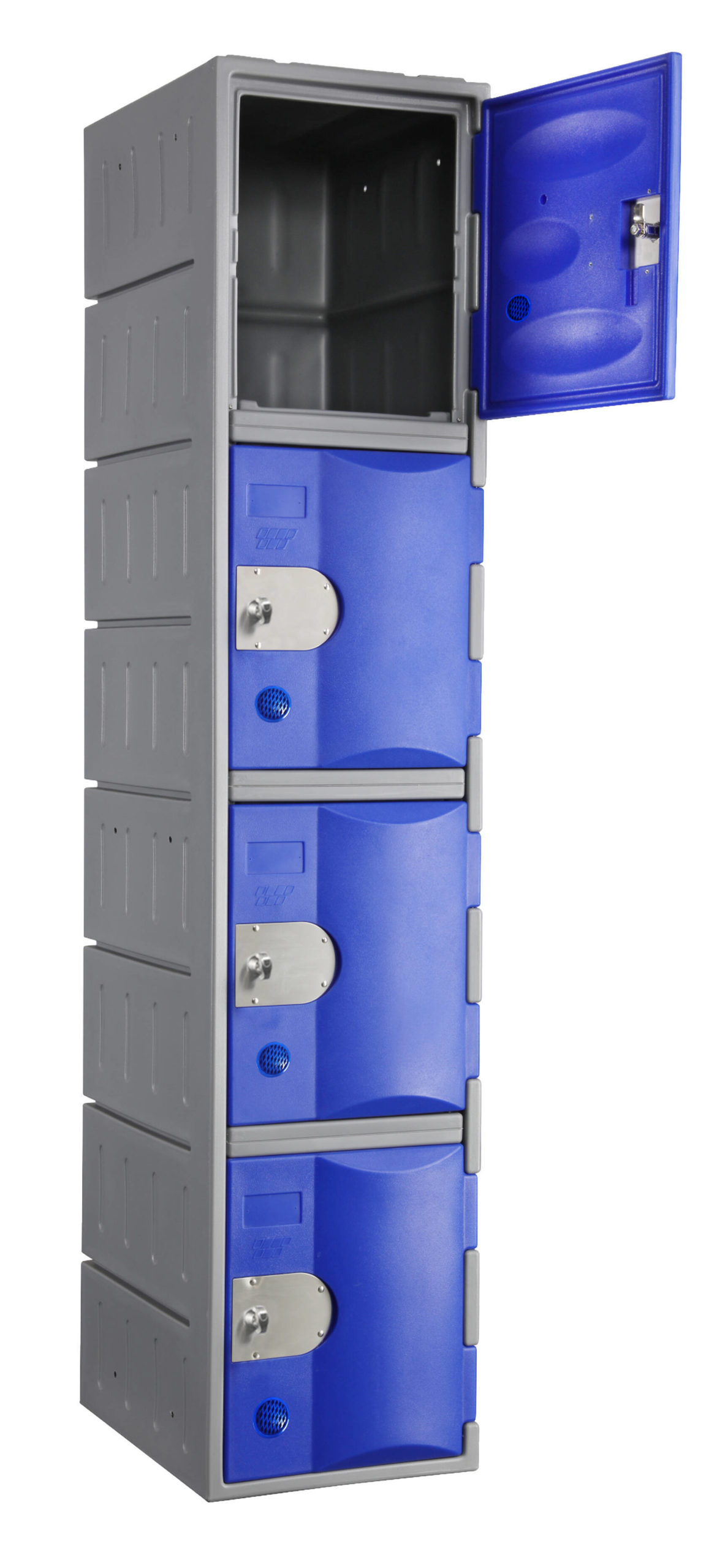 Vestiaire monobloc multicases en polyéthylène haute densité 4 portes par colonne – dimensions : L 385 x P 515 x H 1810 mm – coloris bleu
