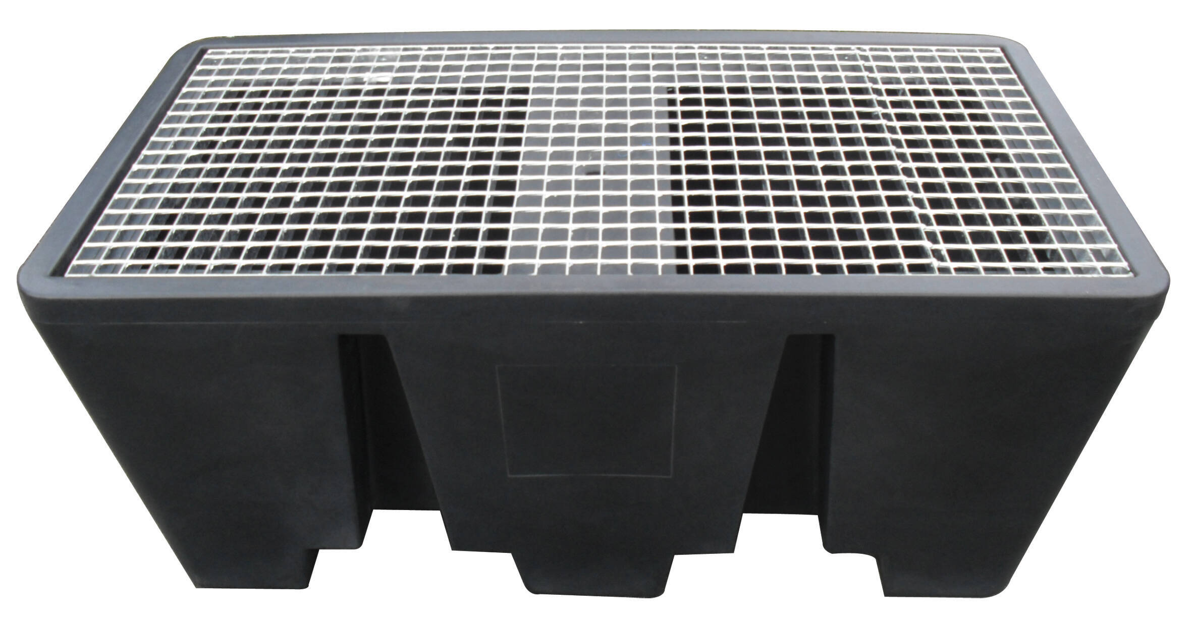 Bac de rétention en polyéthylène haute densité recyclé régénéré pour 2 fûts – dimensions : L 1300 x l. 700 x H 560 mm – volume de rétention 300 litres