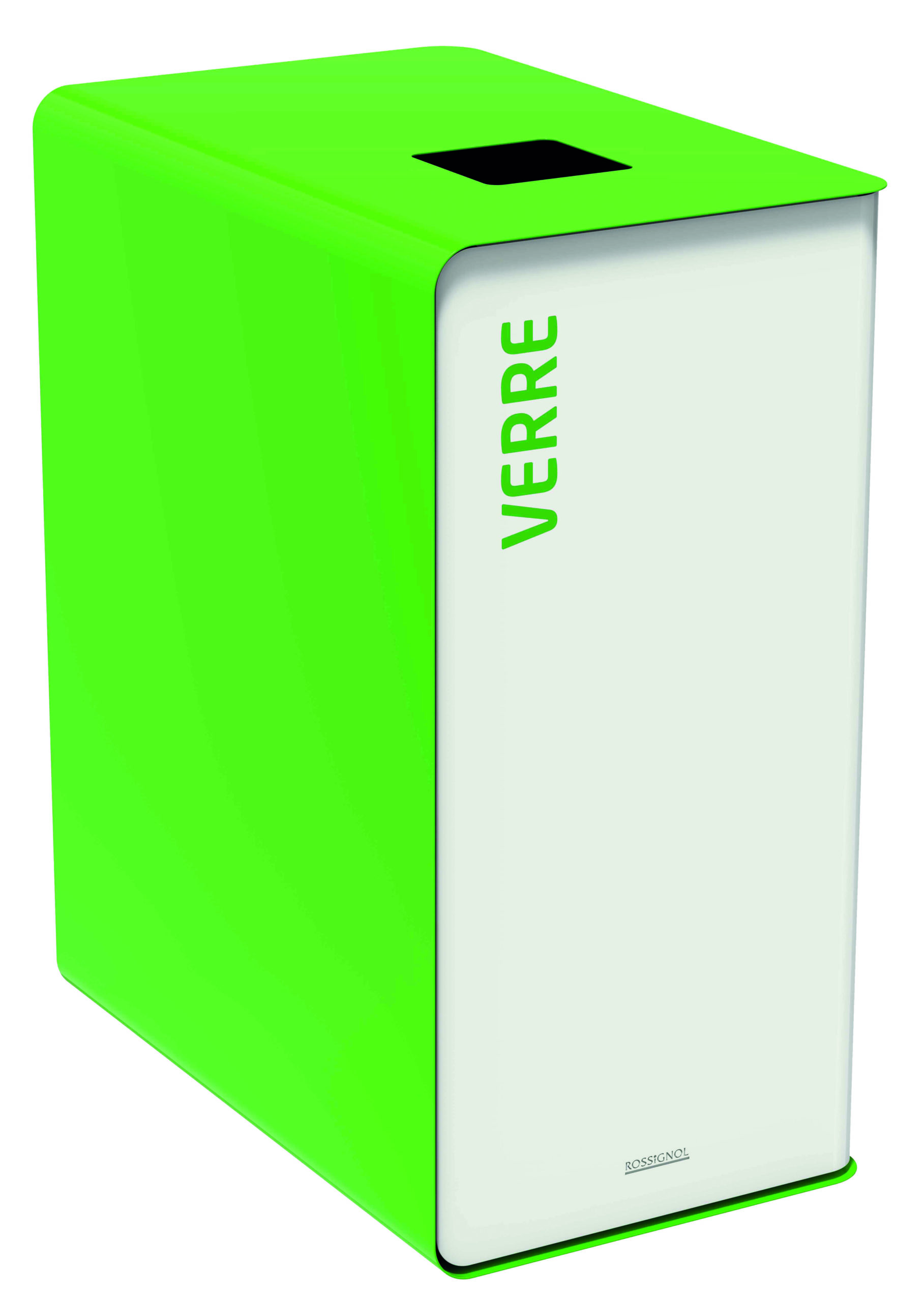 Borne de tri CUBATRI capacité : 90 litres marquage verre – dimensions : L 620 x l. 380 x H 760 mm – coloris porte : blanc corps et couvercle vert