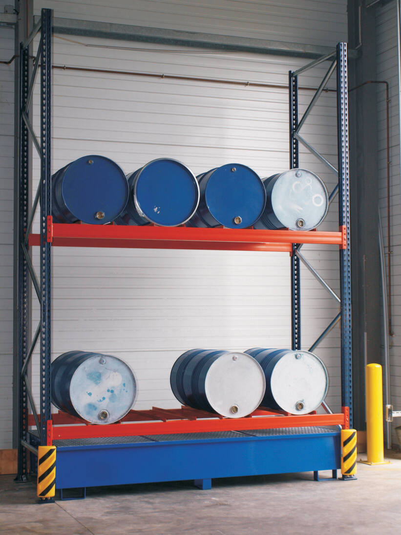 Rayonnage lourd pour 8 f?ts de 220 litres couch?s avec r?tention ? 1000 litres -L: 4000 x P: 2700 x H: 1100 mm ? ?l?ment d?part
