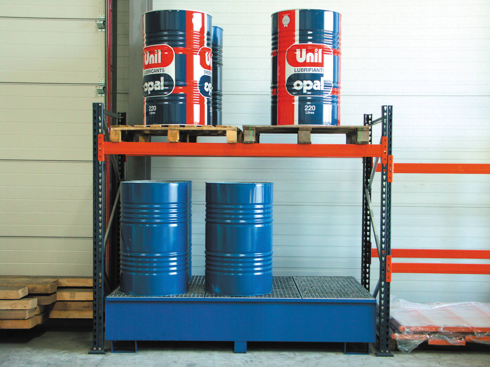Rayonnage semi-lourd pour 10 f?ts de 220 litres avec r?tention ? 600 litres – L: 2225 x P: 1100 x H: 2000 mm ? ?l?ment d?part