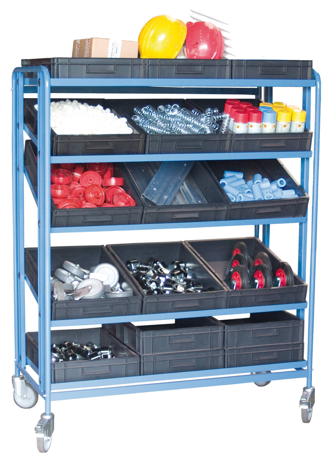 Chariot porte-bacs 5 plateaux tôlés inclinables charge 250 kg – dimensions plateaux : L 1225 x P 610 mm