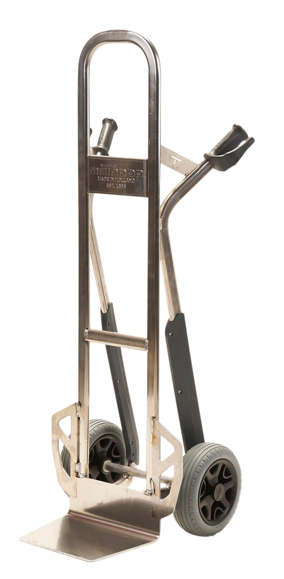 Diable aluminium avec protection plastique tablier droit et sur?lev? bavette fixe charge : 350 kg – dimensions : l. 505 x P 500 x H 1380 mm – roues increvables