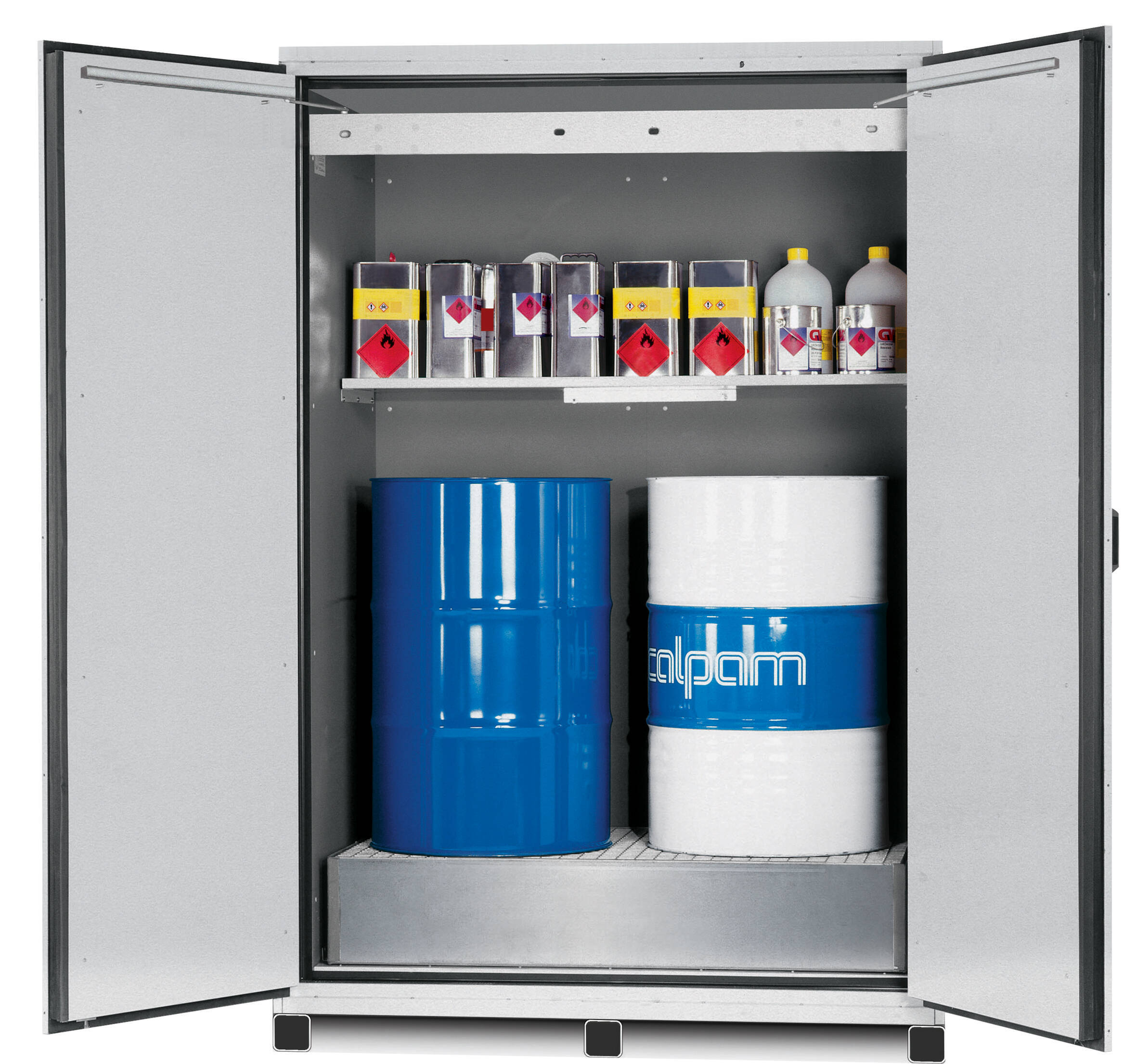 Armoire de sécurité pour fûts 90 minutes – dimensions : L 1555 x P 1018 x H 2224 mm – corps et portes coloris gris