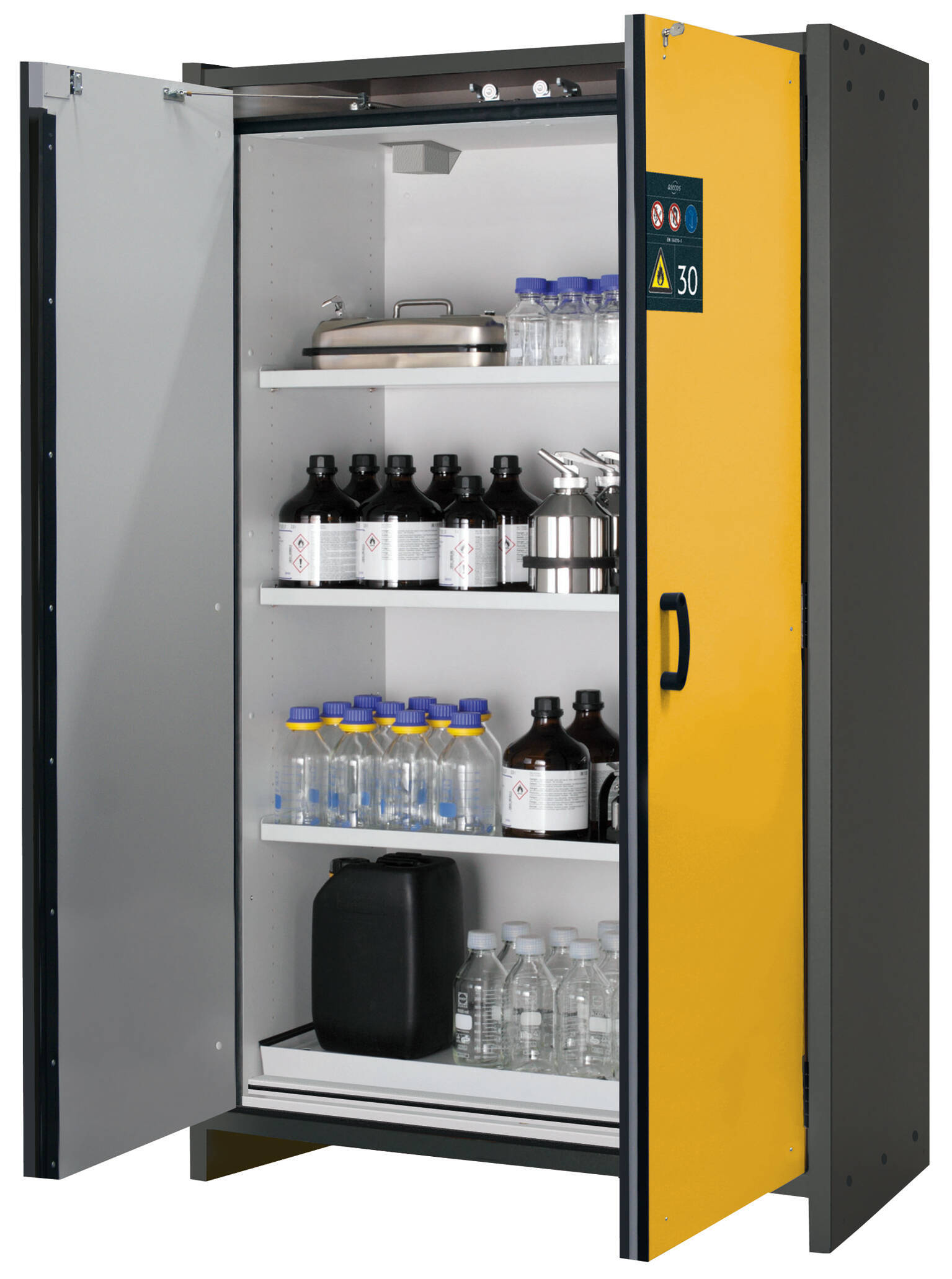Armoire r?sistante au feu : 30 minutes pour produits dangereux – dimensions : L 1160 x P 615 x H 1955 mm – coloris : corps Gris portes Jaunes