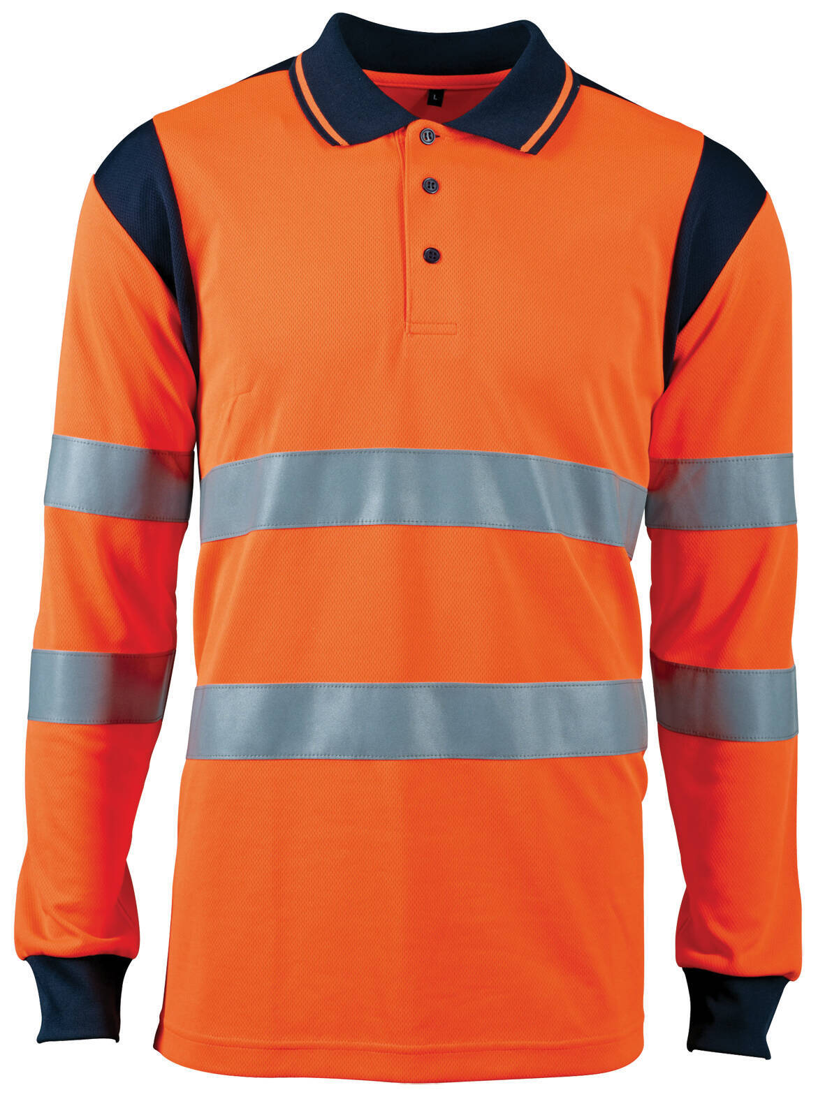 Polo haute visibilité manches longues 2 bandes rétro-réfléchissantes coloris : Orange/Marine – Tailles : S à XXXL