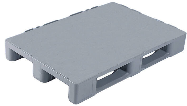 Palette alimentaire en polyéthylène haute densité 3 semelles plateau fermé avec rebords charge dynamique : 2000 kg – dimensions : L 1200 x l. 800 x H 155 mm – coloris gris – conditionnée par 5